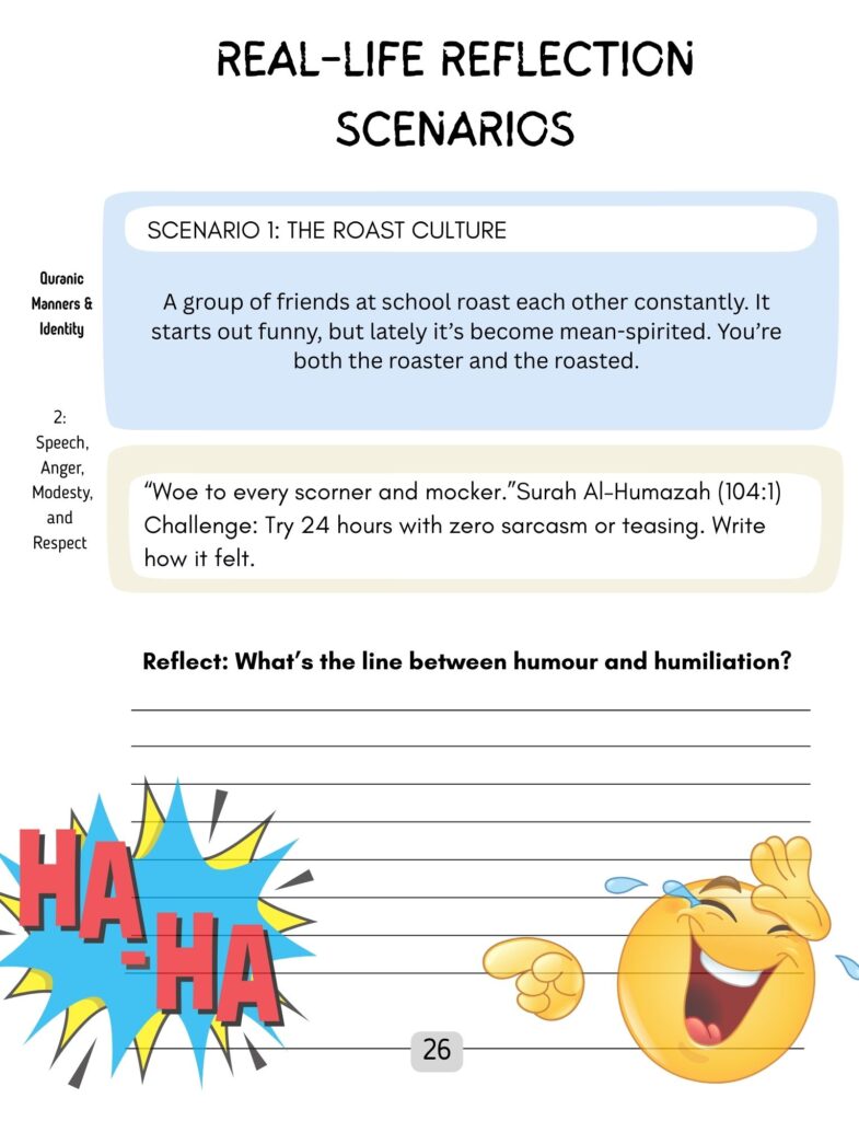 Through relatable characters (Ayesha & Muhammad), children explore everyday moral situations.