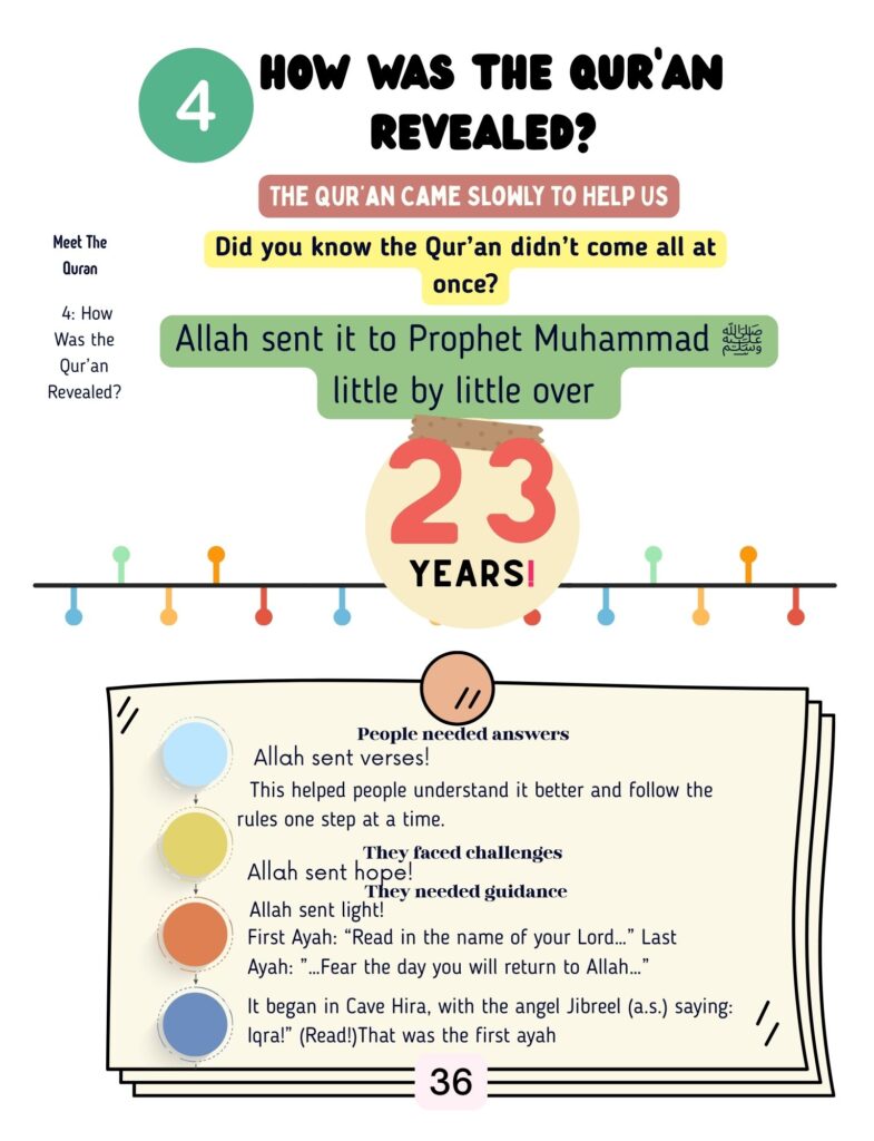 Through puzzles, matching activities, and guided reflection, children begin to understand what the Quran teaches — not just what it says.